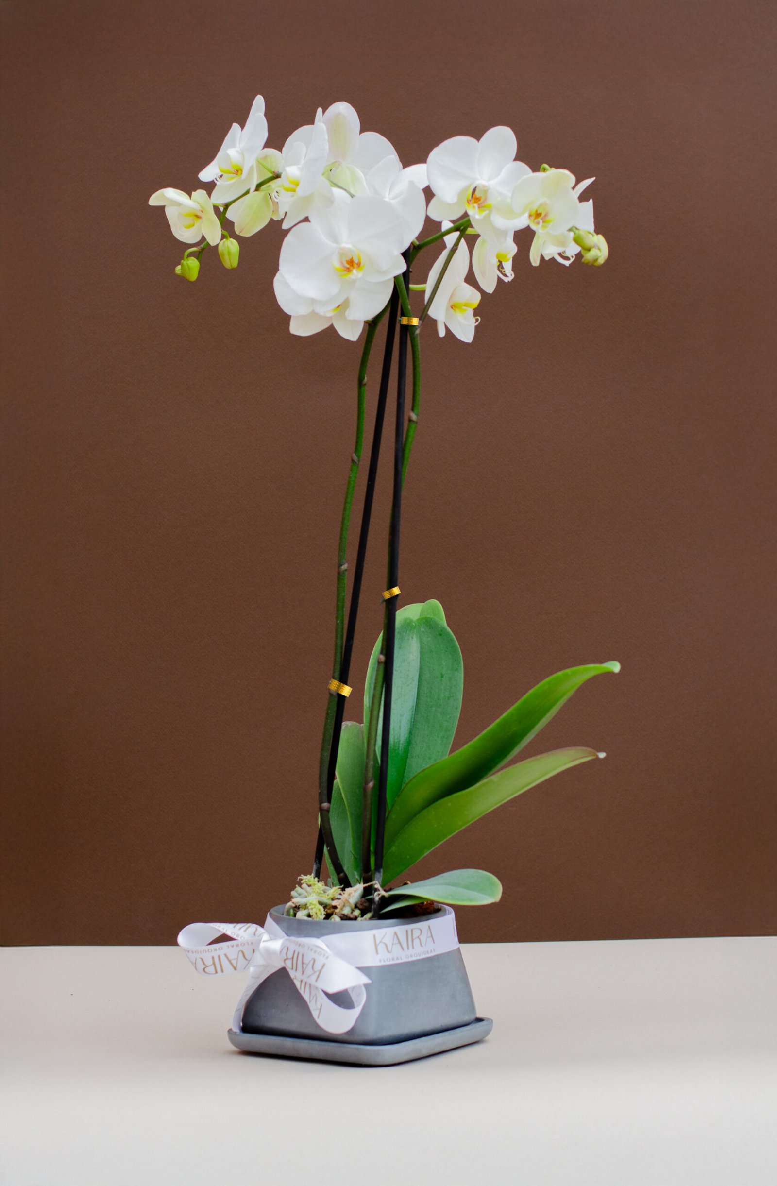 Presentada en una matera de concreto de diseño exclusivo Kaira, en tonos suaves y decorada con nuestro lazo distintivo, este arreglo combina modernidad, delicadeza y un toque de lujo.